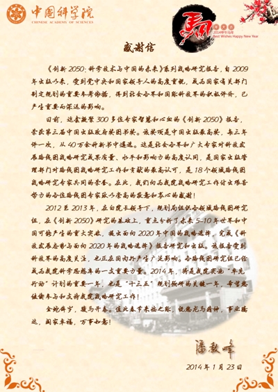 圖:中國科學院感謝信